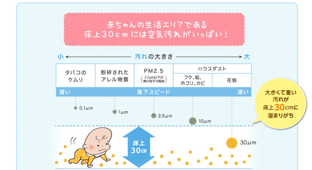 通常、花粉やハウスダストなどの大きくて重い汚れは床上30㎝の範囲に速やかに沈着します。