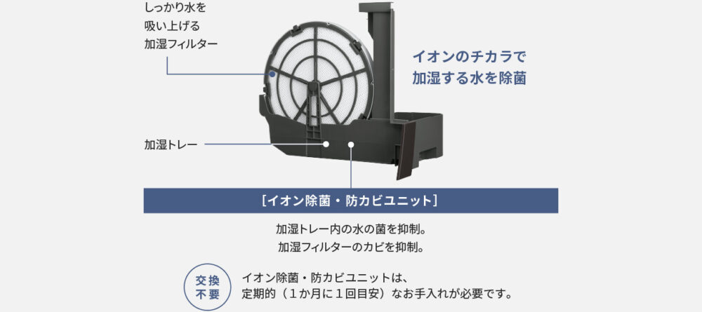 イオンの力を利用して加湿する水を除菌し、加湿トレーと加湿フィルターにおけるカビや菌の発生を抑制します。