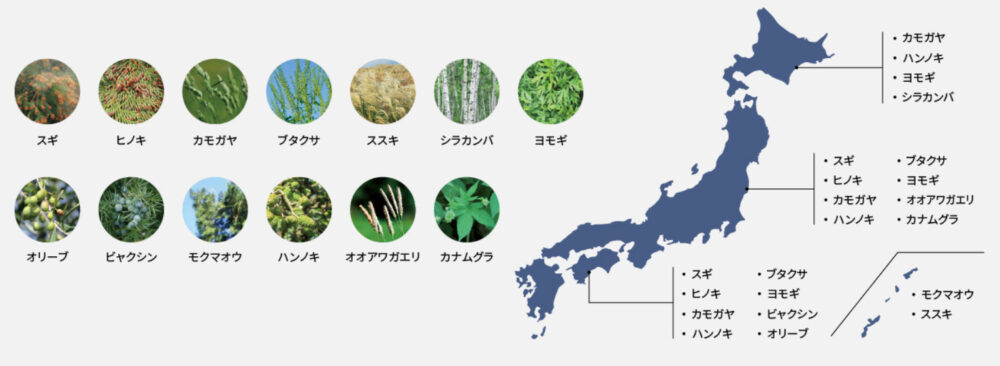スギ・ヒノキ・カモガヤ・ブタクサ・コナヒョウヒダニ・カナリア・インコ・ウサギ・ハムスター・ハツカネズミ・モルモット・チャタテムシ・ゴキブリ・ガ・シラカンバ・ハンノキ・オリーブ・ススキ・ビャクシン・ヨモギ・モクマオウ・カナムグラ・オオアワガエリ・アルテルナリア・ヤケヒョウダニ・マラセチア・アスペルギルス・カンジダ・イヌ・ネコ