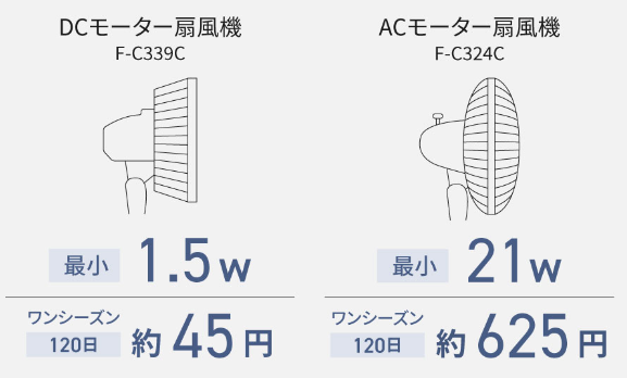 DCモーターを搭載した扇風機の消費電力は、ACモーターを搭載した扇風機の消費電力のおおよそ1/14です。