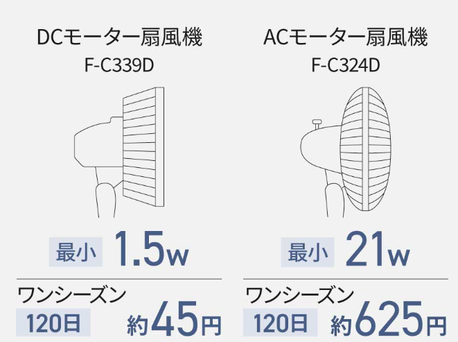 たとえば、ACモーターを搭載した扇風機を1シーズン使用すると、電気代は約625円になりますが、DCモーターを搭載した扇風機を使用する場合は約45円となります。