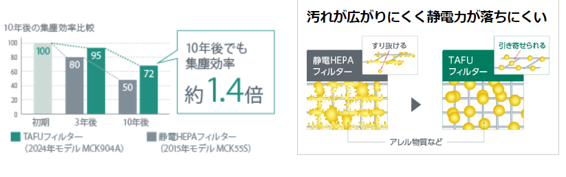 高い撥水・撥油効果を持つ素材を使用したTAFU(タフ)フィルターにより、約10年間フィルター交換が不要でも集塵能力が持続します。