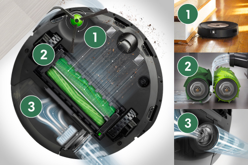 また、アイロボット独自の3段階クリーニングシステムを搭載し、エッジクリーニングブラシ、2本のゴム製のデュアルアクションブラシでフローリングや畳、ラグなど、どんな床も徹底的に清掃します。