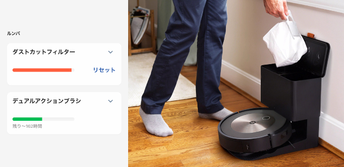 アプリからロボットの状態を確認でき、紙パックの交換時期も一目瞭然です。